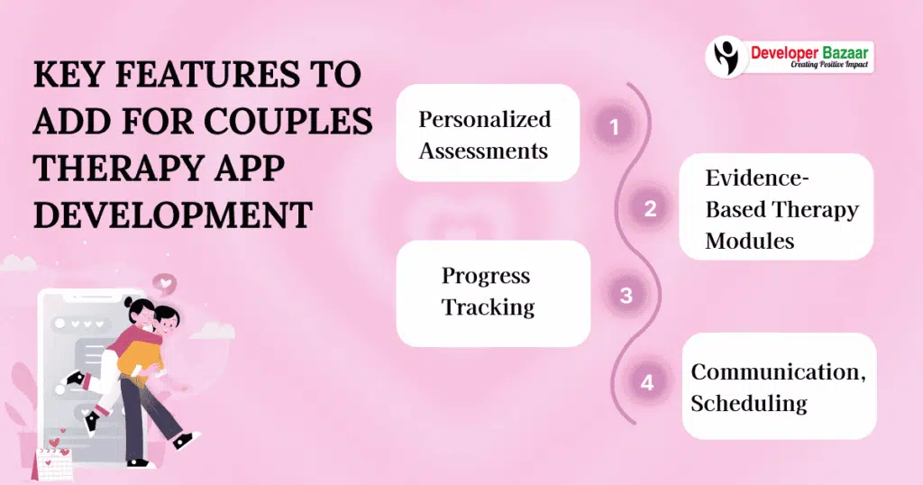 A successful couples therapy app needs more than video calls or chat tools. To create a meaningful impact and sustained engagement, your app should combine evidence-based interventions, personalized experiences, and robust support features. Here are the essential components to consider: