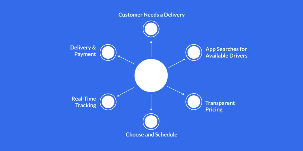 The process begins when a customer wants to send something. They open the app and enter important delivery details such as the size and weight of the item, where it needs to be picked up from, and where it should be delivered. This helps the app understand what kind of delivery service is needed.
