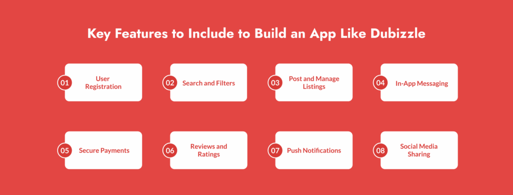 To build an app like Dubizzle that people enjoy using, it must have features that make buying and selling easy, safe, and fast. Below are the most important features you should include: