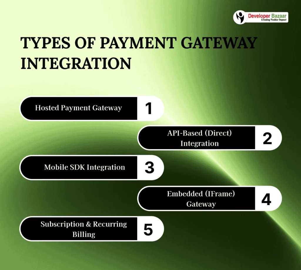 Choosing the right type of payment gateway is very important because it directly impacts both user experience and security. Here are the main types of payment gateway integrations you can consider: