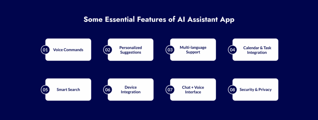 Below are some must-have features that improve user experience and also play a huge role in deciding the AI personal assistant app development cost.